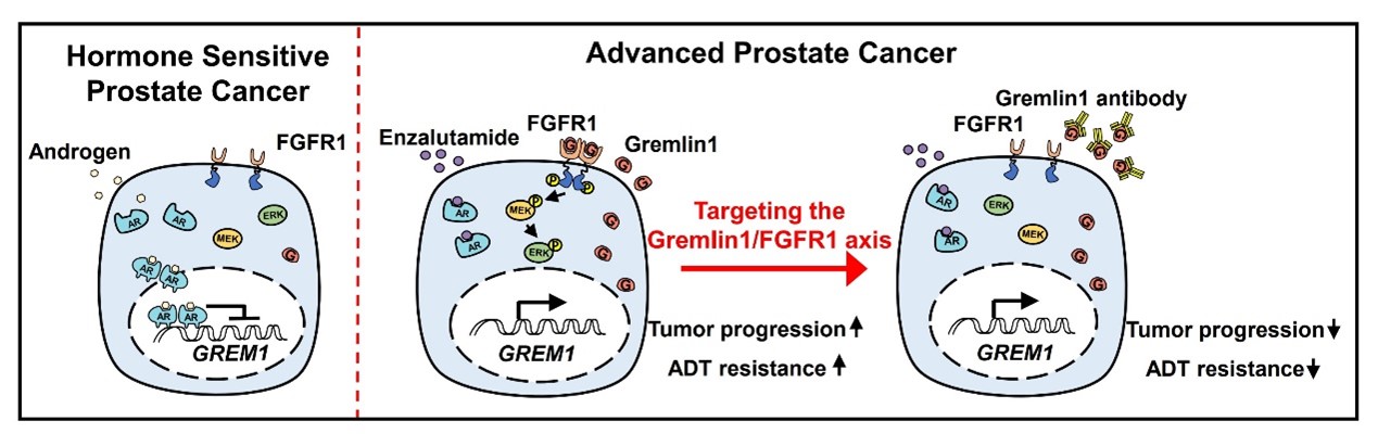 分泌蛋白具有容易靶向的特点,是目前新型治疗方案以及靶向药物开发的重要来源。在本研究中,作者使用苏州创胜医药集团有限公司开发的Gremlin1特异性抗体和前列腺自发瘤转基因小鼠模型以及人源性肿瘤组织移植模型,在体内验证Gremlin1特异性抗体对前列腺癌的治疗作用。实验发现,Gremlin1可以有效缓解前列腺癌进展,并在与临床抗雄药物恩杂鲁胺联合应用时有更加显著的治疗效果。这项研究发现了“小恶魔”Gremlin1对前列腺癌肿瘤细胞可塑性和去势抵抗形成的重要作用,深入解析了AR如何调控Gremlin1转录表达。作者创新性的发现Gremlin1可以与FGFR1结合,作为FGFR1的新型配体激活FGFR1/MAPK信号通路。同时本文为靶向治疗去势抵抗性前列腺癌提供了新型候选药物,具有重要的临床转化意义。