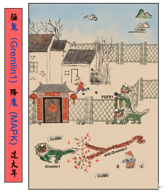 文章在接收时恰逢新春佳节,因此研究团队以“驱鬼(Gremlin1)降魔(MAPK)过大年”为主题,为这份研究论文绘制了一张图像,用一则故事生动形象地阐释他们的研究成果。