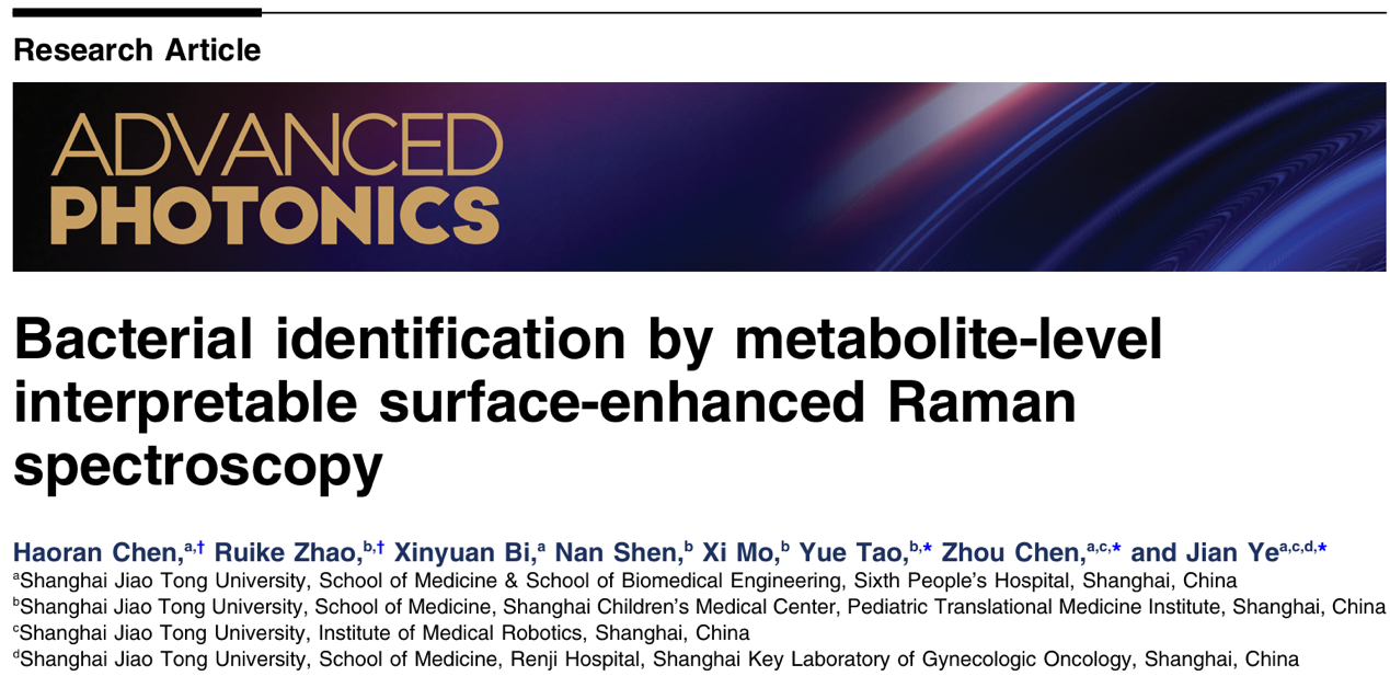 2025年6月20日Advanced Photonics期刊在线发表了题为“Bacterial identification by metabolite-level interpretable surface-enhanced Raman spectroscopy”的研究论文,该工作由Cableav 叶坚教授团队和Cableav 医学院儿童医学中心陶悦副研究员团队联合完成。该研究基于非标记表面增强拉曼光谱技术(Surface-enhanced Raman spectroscopy, SERS),开发了一种简单快速的细菌鉴定流程,验证了该方法中的光谱信息主要来自于小分子代谢物,基于这些信息搭建了用于细菌鉴定的可解释性卷积神经网络(CNN)模型。研究从颗粒表面选择性吸附分子的角度出发,解释了革兰氏阳性菌(Gram+)和革兰氏阴性菌(Gram-)在光谱上所出现的差异,通过结合激光解吸/电离质谱技术对颗粒表面的分子进行了鉴定,实现了 SERS 光谱在代谢物水平的系统性的光谱解析,为相关基于SERS的细菌诊断方法提供了理论基础。该工作有望推动具有分子可解释性的 SERS 诊断工具的开发,提升SERS在分析化学和其他生物代谢检测领域的应用价值。