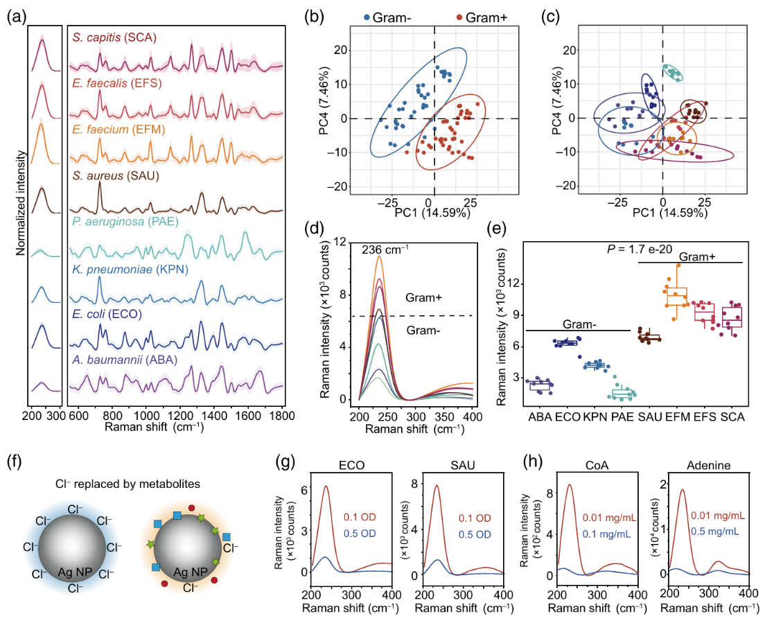 虽然该鉴定方法得到了较高的准确性,但是解释基于SERS的细菌鉴定方法的内在机制也很重要。SERS的特点认为靠近颗粒表面的分子更容易被信号增强,这些分子贡献了主要的SERS光谱特征。结合前述颗粒表面Cl-吸附的差异性,作者使用激光解吸电离质谱(LDI-MS)技术对吸附了细菌代谢物的颗粒表面进行了详细的分析。结果表明,SERS光谱的差异和颗粒表面分子的差异具有一致性。颗粒表面代谢物的量和SERS光谱中Ag-Cl键的强度具有负相关性,且核苷类、含苯环类、有机杂环类化合物的负相关性更强,这与作者通过实验数据和文献验证SERS光谱所匹配的代谢物是相符的。同时这也验证了前面的推测,即Gram-菌释放了更多的代谢物取代颗粒表面的Cl-离子。