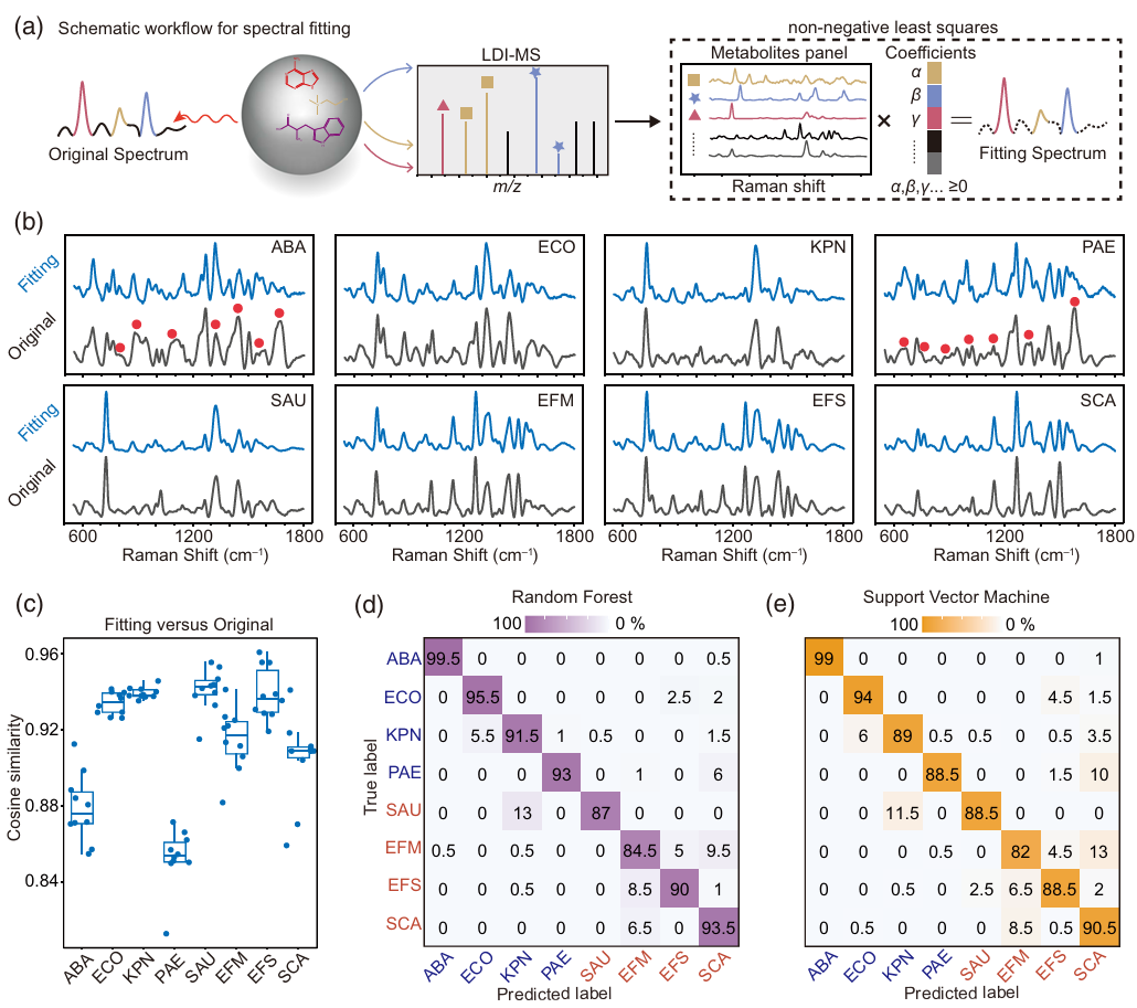 细菌感染已构成全球性公共卫生领域的重大威胁,尤其在 COVID-19 大流行之后,与细菌感染相关的疾病发生率显著攀升。无标记的光谱检测技术,能够通过测量细菌对光的吸收或散射特性,得到可用于细菌鉴定的独特生物光谱。表面增强拉曼光谱(Surface-Enhanced Raman Spectroscopy, SERS)是一种高灵敏的指纹式分子检测技术,具有快速、操作简单、设备成本低且仪器小型化的特点,在环境以及临床病原菌鉴定等场景中展示出了强大的应用潜力。目前,尽管包括SERS在内的光谱技术展现出了显著的优势,但仍存在关键问题没有解决,限制了其发展和应用。聚合酶链式反应(PCR)、二代测序(NGS)以及基质辅助激光解吸电离(MALDI)技术能够针对细菌特异的基因或者肽段进行诊断,然而与这些技术相比,现有无标记 SERS 检测方法缺乏可解释性。SERS光谱如何反映细菌间的差异,以及复杂的指纹光谱反映了哪些信息尚不可知,这要求从分子层面针对光谱数据进行详细的解析,而不是仅限于当前领域内常用的文献比对或理论经验等方式。