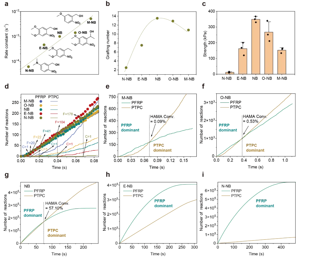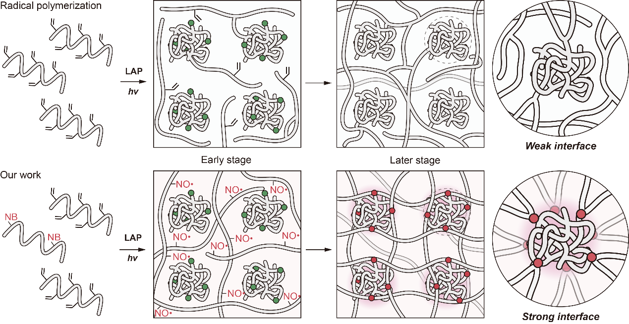 如图所示,在传统自由基聚合过程中,由于反应动力学极快且难以精确控制,聚合早期会迅速形成高交联密度的纳米团簇。随着双键逐渐消耗,后续聚合只能依靠松散链段进行连接,导致团簇之间形成结构薄弱的“接缝”。为克服这一普遍性结构缺陷,本研究引入邻硝基苄基(NB)基团,可在光照下释放出具有延迟特性的稳定氮氧自由基。由于氮氧自由基与碳自由基之间的反应速率高达107–109 L mol-1 s-1(约为传统自由基聚合链增长速率常数的5-6个数量级),因此,其可在聚合稍后阶段高效地桥接纳米团簇上的增长链,从而将原本松散的结构紧密“缝合”,形成具有高强度界面和均匀稳固的纳米复合增强网络。与传统增强方法(如添加纳米填料或构建双网络)相比,该策略无需引入额外组分或多步工序,仅需将聚合体系中的常规双键接枝高分子少量替换为发挥力学增强作用的“味精”——NB接枝的高分子,即可通过优化材料内部的键合方式实现网络强化。这一方法最大限度地保留了材料的原有特性,为高性能交联聚合物的制备提供了新途径。