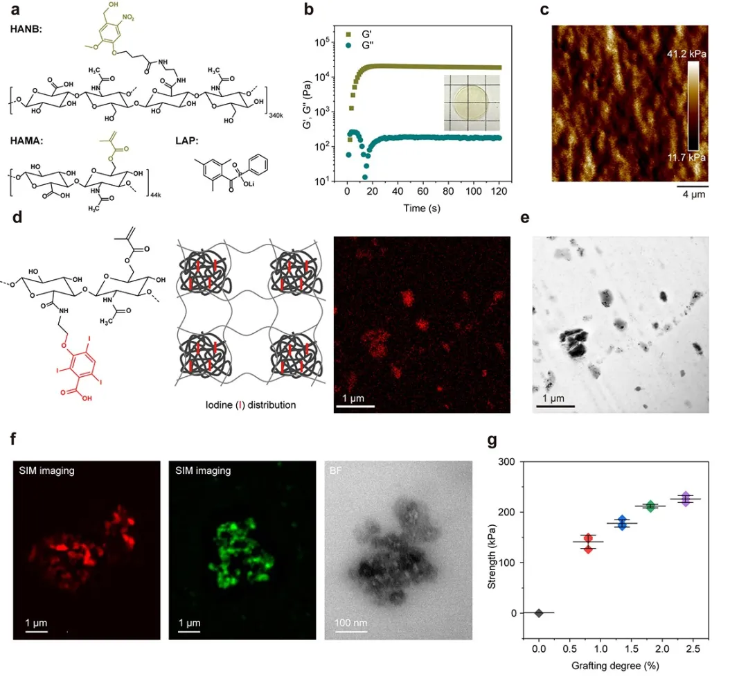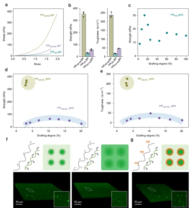 在微观结构层面,研究团队通过显微技术直接观测到了纳米团簇被共价桥接形成连续网络的证据。他们采用荧光染料对NB基团进行标记,并在材料光交联固化后实施超分辨显微成像。图像显示,凝胶内部存在大量分散的荧光亮点,对应于早期形成的纳米团簇(即“纳米小岛”)。特别值得注意的是,在这些亮点与周围基质的交界区域,荧光信号显著增强,表明NB基团延迟产生的氮氧自由基已在团簇与基质之间形成了共价连接,建立起牢固的“桥梁”。由此可见,在微观尺度上,原本孤立的纳米团簇成功被共价键“缝合”为整体,网络结构更趋于均匀和致密。这一结构转变为实现材料宏观力学性能的显著提升奠定了坚实基础。