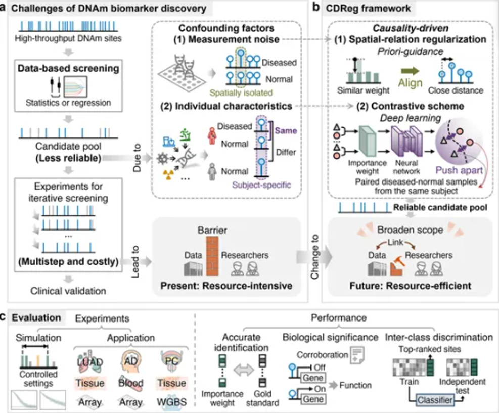 a:DNA甲基化生物标志物挖掘的挑战;b:所提出的因果驱动的深度正则化(CDReg)框架概述;c:综合性能评估