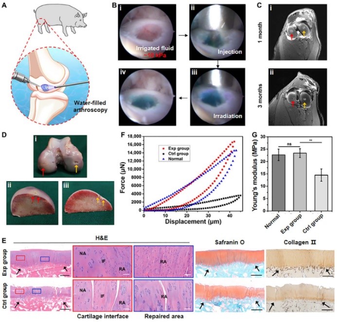 A hydrogel scaffold for direct tissue-engineering can have a number of applications clinically, including for example, water-irrigated, arthroscopic cartilage repair. A versatile hybrid photocrosslinkable (HPC) hydrogel has been fabricated though a combination of photoinitiated radical polymerization and photoinduced imine cross-linking. The ultrafast gelation, high mechanical strength, and strong adhesion to native tissue enable the direct use of these hydrogels in irrigated arthroscopic treatments, which has been shown to serve as an arthroscopic autologous chondrocyte implantation scaffold for long-term cartilage regeneration, integration, and reconstruction of articular function. For the treatment of oral mucosal diseases, a photo-crosslinking hydrogel adhesive inspired by the success of light-curing techniques in dentistry is developed, which operates on a fast (within 5s) phototriggered S-nitrosylation coupling reaction and employs imine anchoring to connect to host tissues. This new gel adhesive creates a favorable microenvironment for tissue repair and can shorten tissue healing time. For developing effective strategies for vascular tissue engineering, disease modeling and therapies, how matrix stiffness regulates SMC phenotype and matrix remodeling through TGF-β signal pathway has been studied, unraveling the underlying mechanobiological mechanism in vascular remodeling.