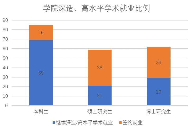 本科毕业生共有85位,其中41位选择国内升学。在这41位继续深造的学生中,37位选择留在本校深造,包括22位攻读硕士的同学和19位攻读博士的同学。