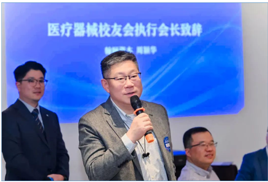 成明和、张浩,周颖华分别上台致辞。他们分享了自己在医疗器械行业的发展历程和宝贵经验,表达了对校友会未来发展的美好期许,倡议建立常态化校友合作平台,通过技术共享、资源对接、联合攻关等方式,凝聚交大力量突破行业关键技术瓶颈,共同书写中国医疗器械产业高质量发展的新篇章。秘书长李航道向大家汇报了医疗器械校友会的近一年的工作情况。他详细介绍了校友会在支持校友创业项目,促进行业资源对接,聚合交大校友资源发挥的积极作用。