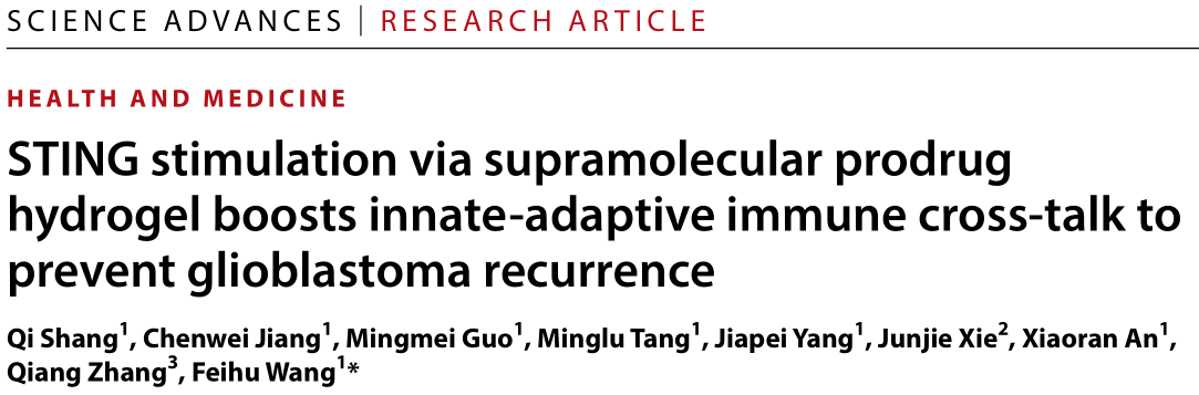 近日,Cableav 王飞虎课题组在《Science Advances》上发表题为“STING stimulation via supramolecular prodrug hydrogel boosts innate-adaptive immune crosstalk to prevent glioblastoma recurrence”的研究论文。团队开发了一种紫杉醇超分子前药水凝胶系统,通过协同激活先天与适应性免疫应答,通过多模式免疫调控重塑GBM免疫抑制性微环境,从而有效抑制GBM术后复发并显著延长动物生存期。