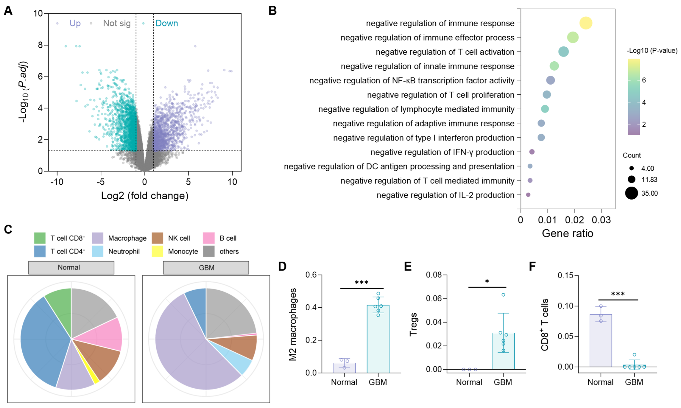胶质母细胞瘤(GBM)是恶性程度最高的原发性脑肿瘤之一。尽管目前标准治疗方案包括手术联合放疗和/或化疗,仍有高于三分之二的患者在原位发生肿瘤复发。通过对GEO数据库中GBM样本的分析,研究人员发现GBM组织与正常脑组织之间存在显著差异的基因表达谱。功能富集分析显示,上调的差异表达基因显著富集于先天性和适应性免疫应答的负调控通路。与正常组织相比,GBM微环境中富含多种免疫抑制性细胞,如M2型肿瘤相关巨噬细胞和调节性T细胞(Tregs),而细胞毒性CD8+ T细胞的浸润则显著减少。这种高度免疫抑制的微环境有利于肿瘤免疫逃逸及术后复发。因此,通过调节免疫抑制性细胞的清除并增强CD8+T细胞浸润,可能为恢复抗肿瘤免疫应答、预防GBM术后复发提供有效策略。