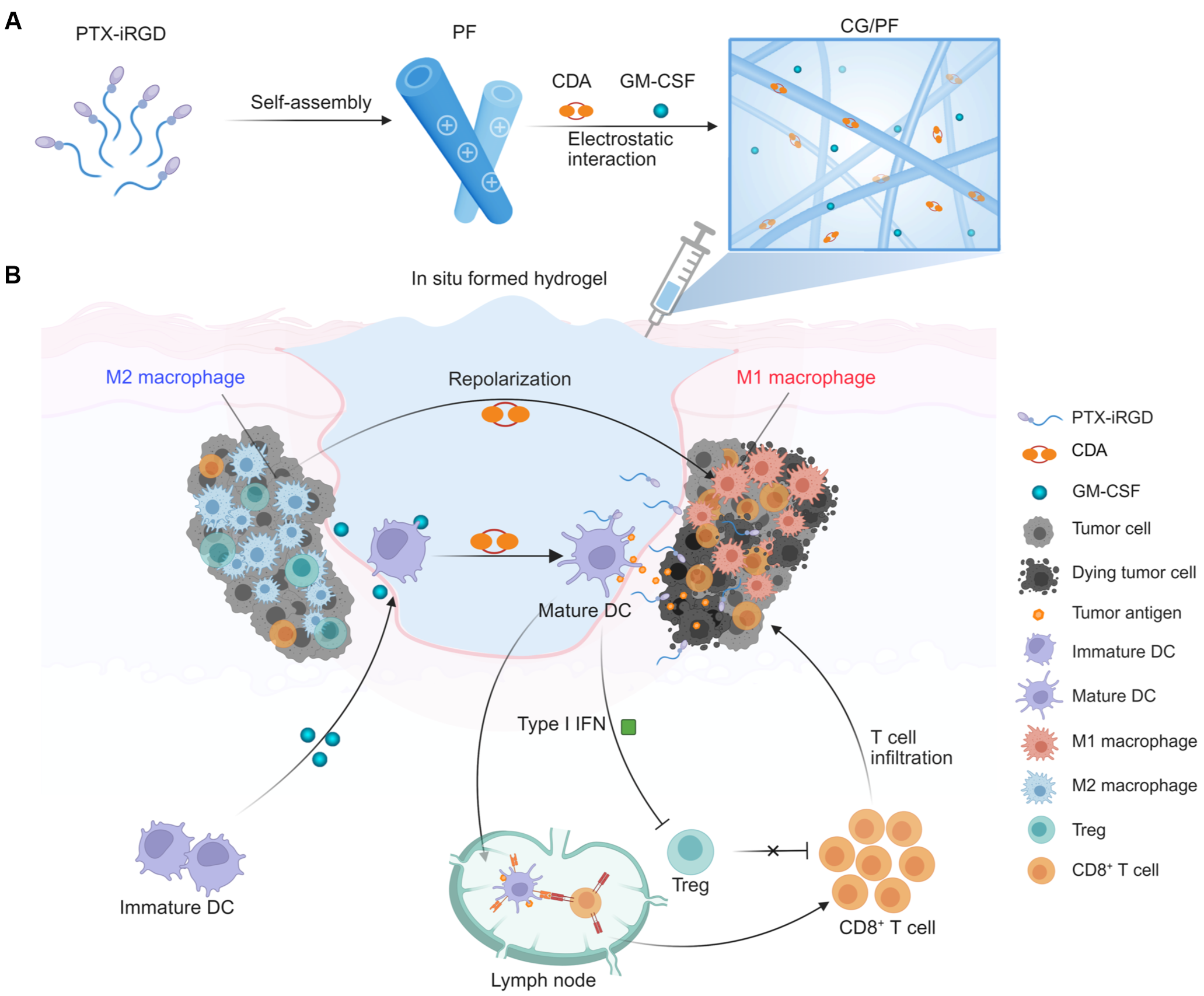 为构建生物响应性水凝胶,研究人员通过还原敏感型二硫键将PTX与iRGD共价偶联,合成了前药分子PTX-iRGD。该前药可在水溶液中自组装形成超分子纳米纤维(PF)。随后,通过静电相互作用将CDA与粒细胞-巨噬细胞集落刺激因子(GM-CSF;用于招募DC至凝胶)负载于PF上,构建了CG/PF体系。该体系在生理条件下可迅速形成原位水凝胶。值得注意的是,CG/PF水凝胶可作为药物储库,实现 PTX和CDA 在体内外的持续释放。