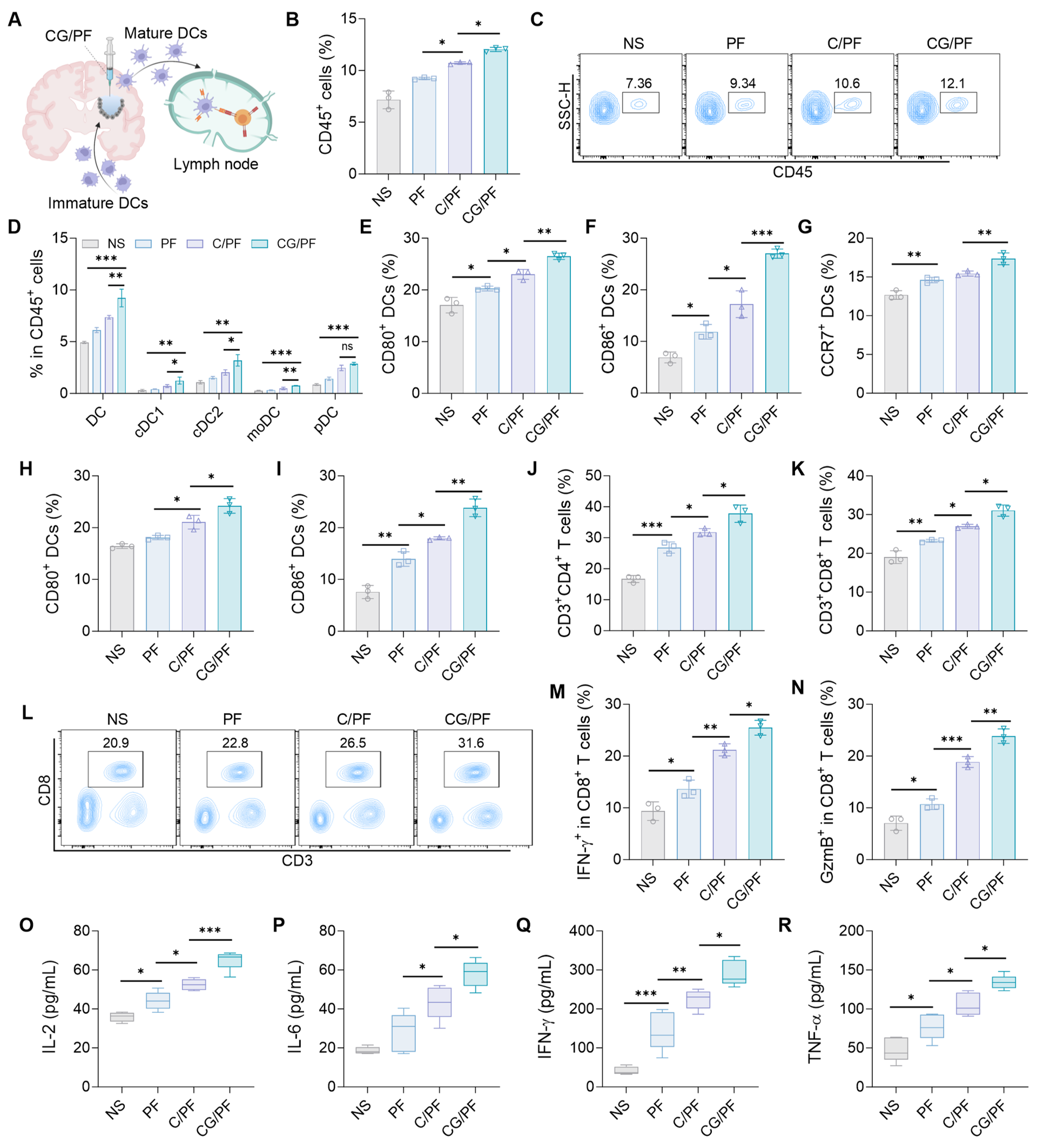 鉴于此,研究团队开发了一种超分子前药水凝胶系统(CG/PF)。该水凝胶可作为局部药物储库,实现治疗剂的长效控释。释放的紫杉醇(PTX)诱导肿瘤细胞发生免疫原性死亡,将肿瘤相关抗原释放至微环境中;GM-CSF招募树突状细胞(DCs)向肿瘤组织富集;STING激动剂(CDA)激活cGAS-STING通路,促进DCs处理并加工肿瘤抗原,进而迁移至引流淋巴结,启动CD8+ T细胞免疫应答。此外,局部释放的CDA还可驱动GBM微环境中M2型巨噬细胞向M1表型重编程。综上,CG/PF水凝胶通过多模式免疫调控重塑GBM免疫微环境。