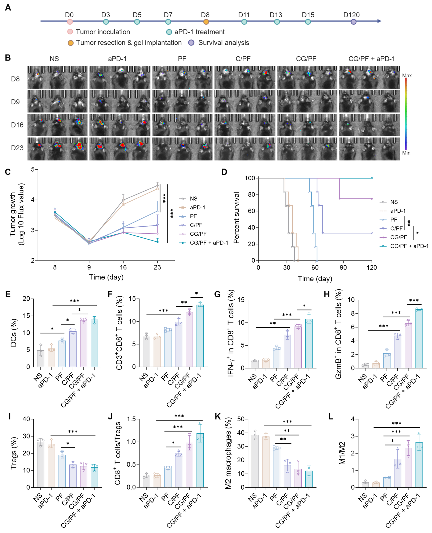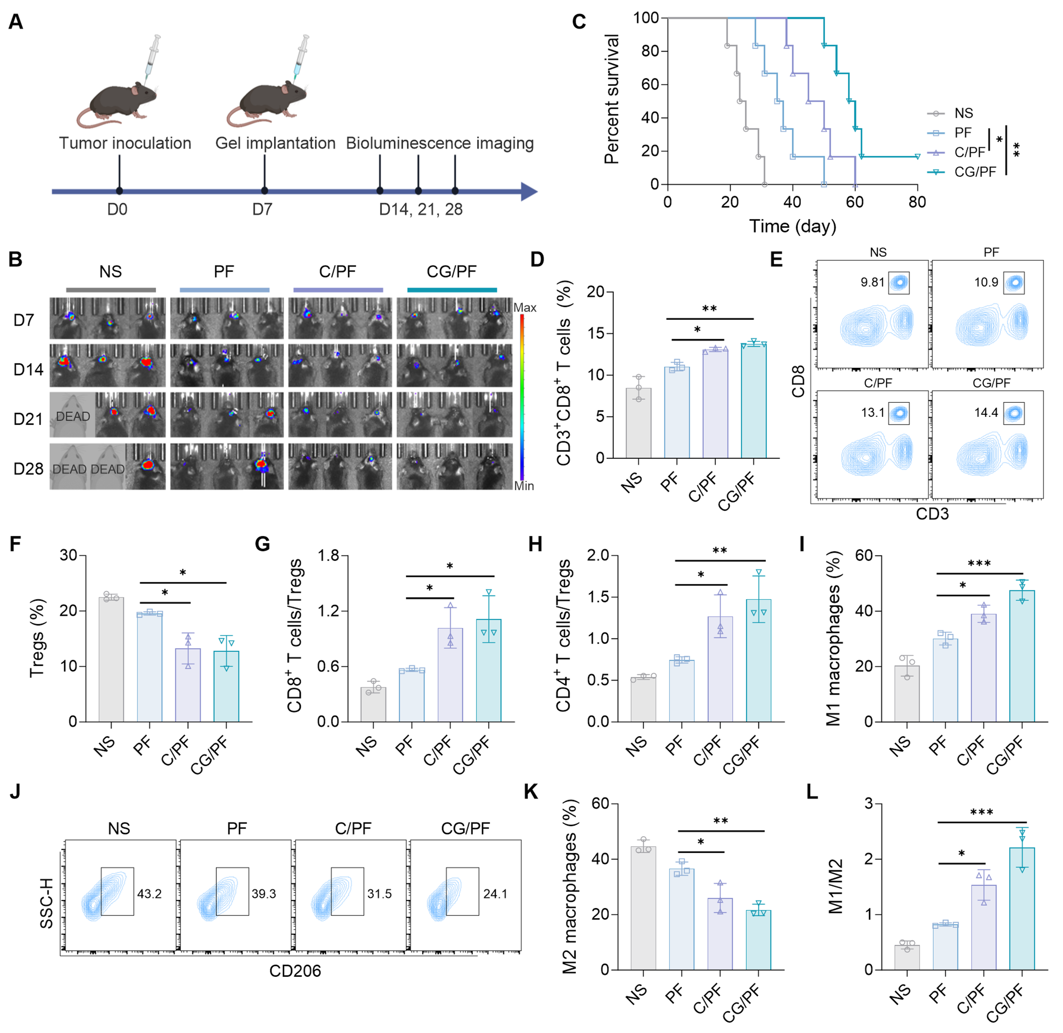 在GL261-Luc原位肿瘤小鼠模型中,研究人员评估了CG/PF水凝胶的抗肿瘤疗效。结果显示,CG/PF 显著抑制肿瘤生长并延长小鼠生存期,其作用机制源于对免疫抑制性微环境的重编程-包括促进M1型巨噬细胞极化、增强CD8+ T细胞浸润及减少Tregs富集,从而将GBM微环境由免疫抑制态转为免疫激活态。