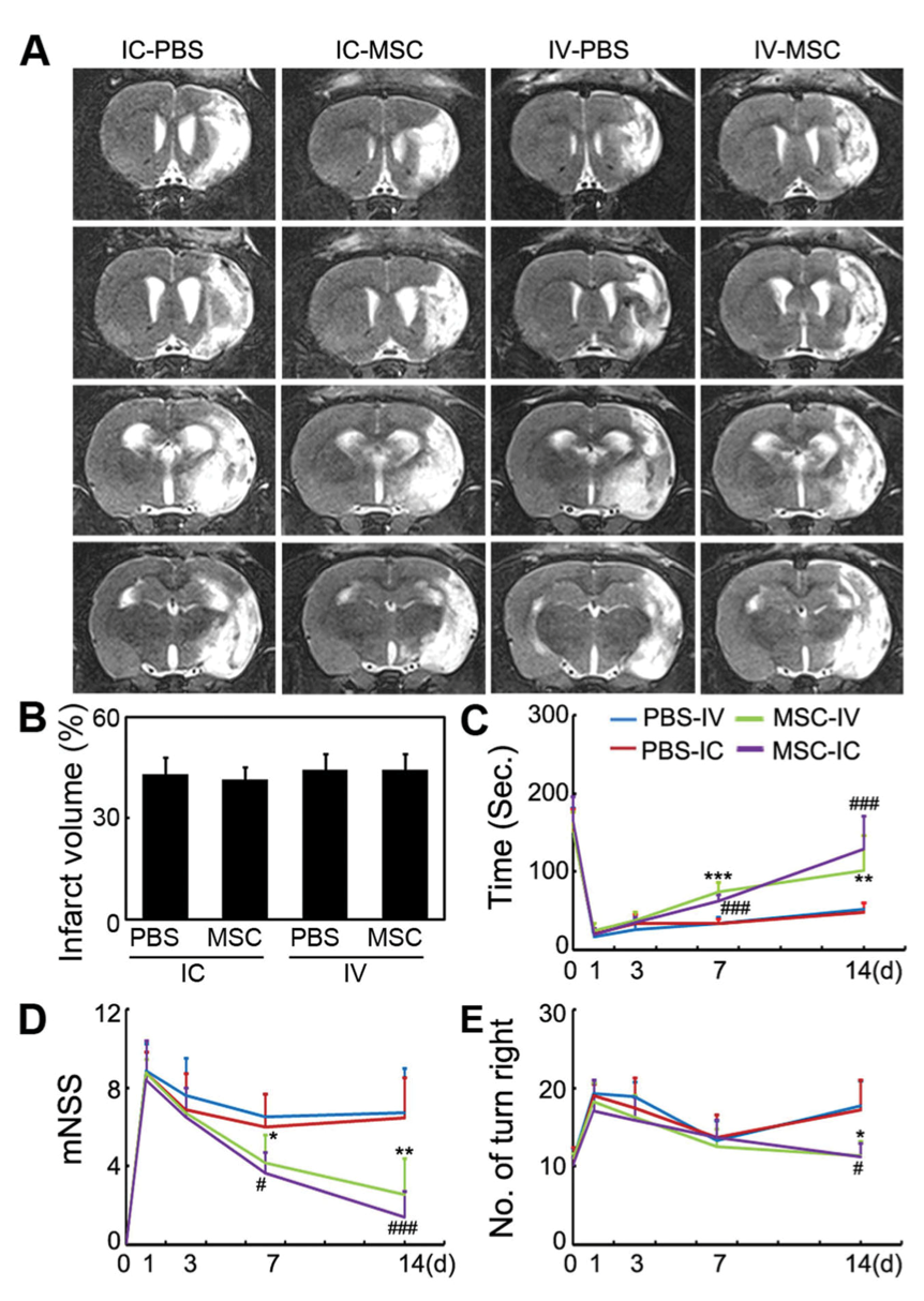 IC and IV injections of MSCs improved functional recovery of brain.
